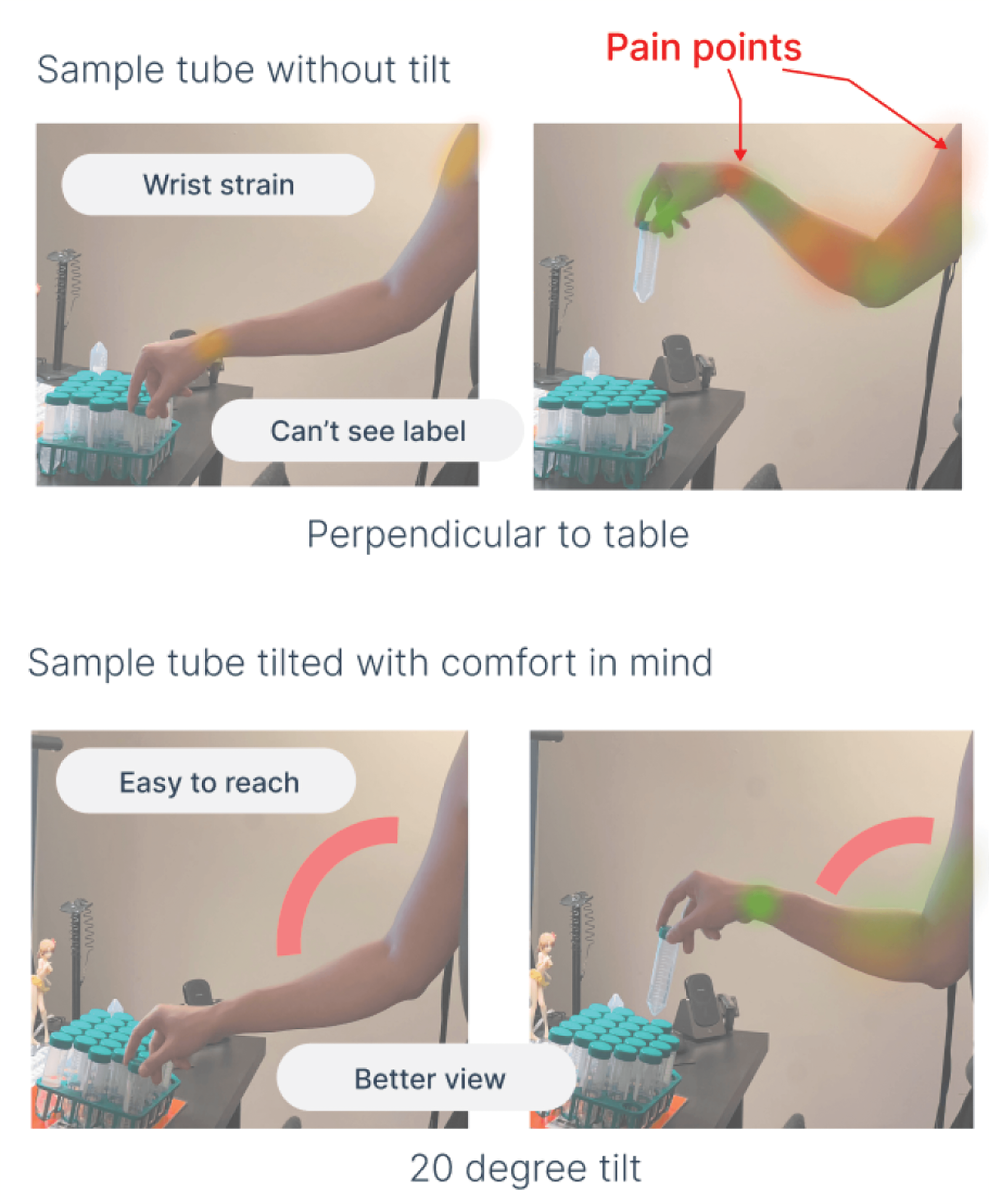 Ergonomic overlays helped anticipate and make sense of wrist strain during tube removal with a precision grip and narrow down ideal conditions for package (dis)assembly.
