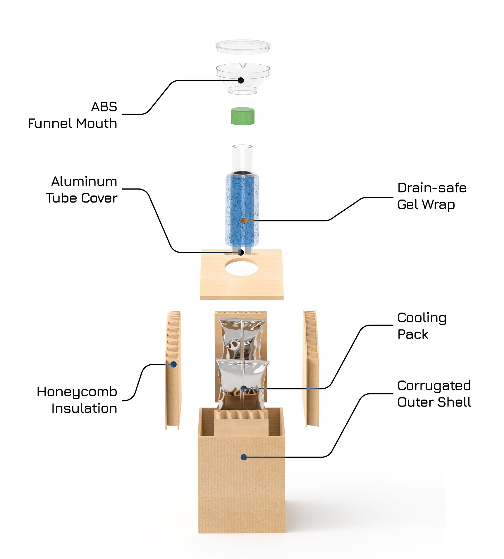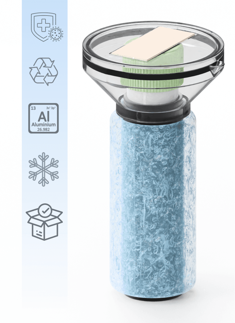 Funnel mouth guides easy 3-finger access and leakproofs while a direct connection to a cooling pack of choice through conductive aluminum allows for stable internal temperatures. Fully reusable/recyclable.
