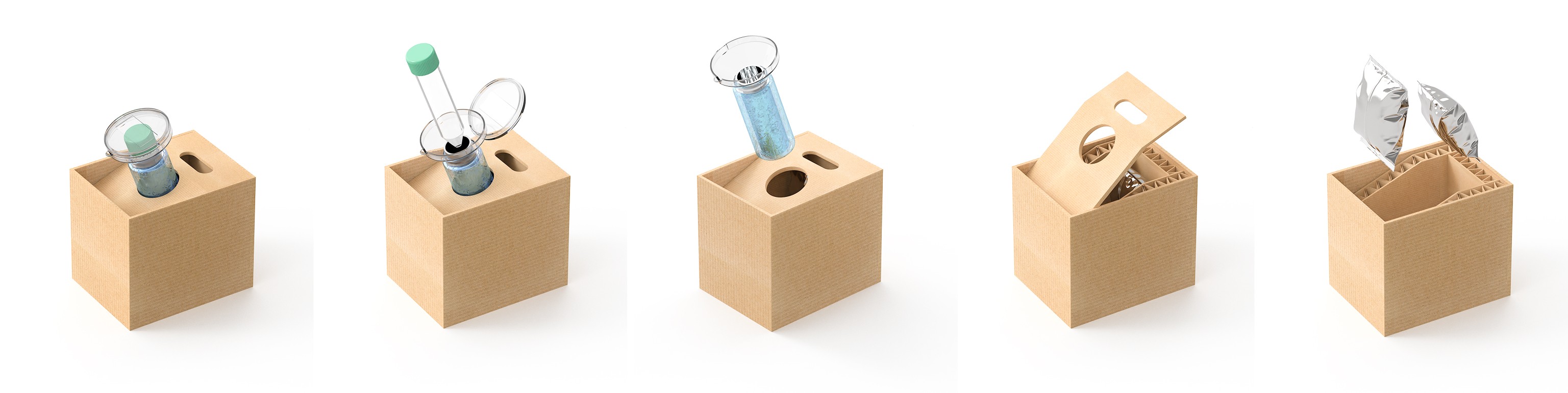 A modular dual-container cold-chain shipping system built from targeted reusable and biodegradable components. Material and ergonomic cues ensure reliable temperature control, prevent sample breakage and contamination, and significantly reduce environmental impact.